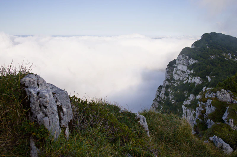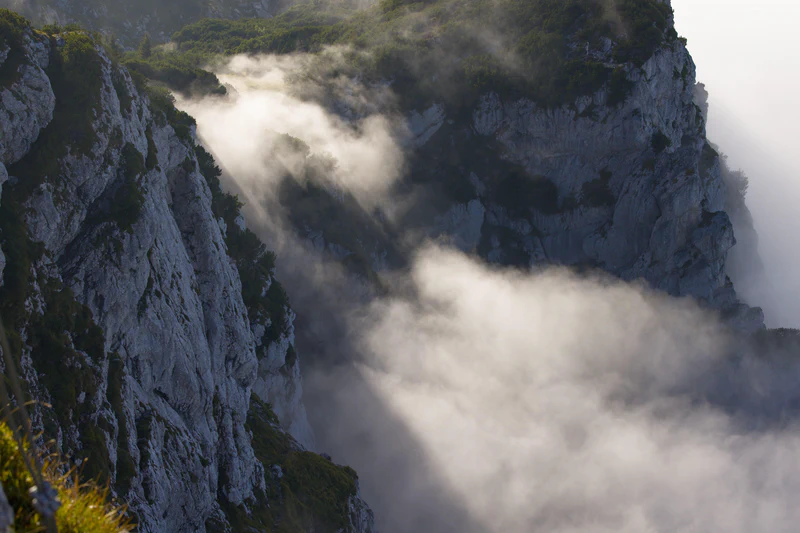With the ibex gone, I continued my way towards the summit. On the way, I spotted another ibex in the bushes, but there was no chance of getting a good photo, since there was just too much scrub between us. At the peak, the conditions were incredible: I was above the clouds. The ridge of the Benediktenwand was like a ship sailing across a sea of clouds.