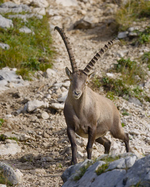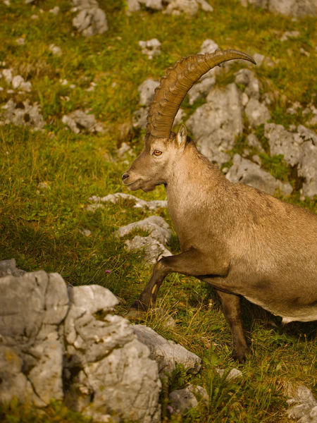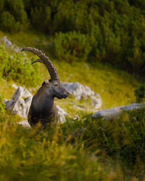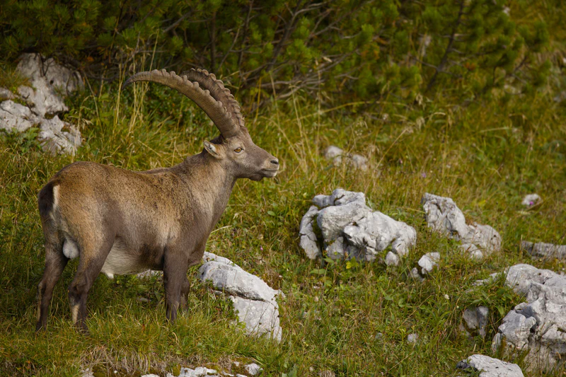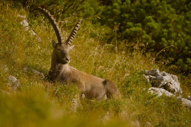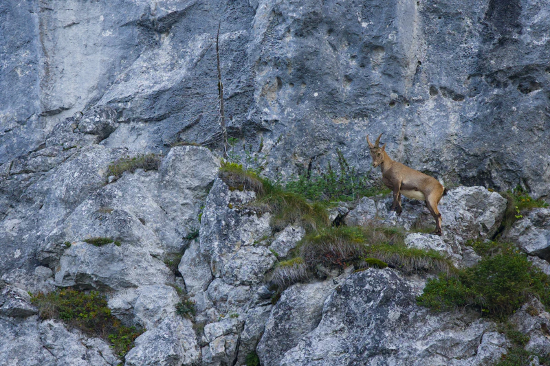 The Alpine Ibex, or “Steinbock” as it’s known in German, is a symbol of the Alps. These magnificent creatures are characterized by their distinctive curved horns, which can grow to impressive lengths. They can reach a weight of 120 kg and are very good at moving on even the steepest slopes. Once on the brink of extinction in the 19. century, conservation efforts have allowed their population to recover. It was in 1959 that the ibex gained a foothold on the Benediktenwand. Currently, the population comprises about 100 animals there.
