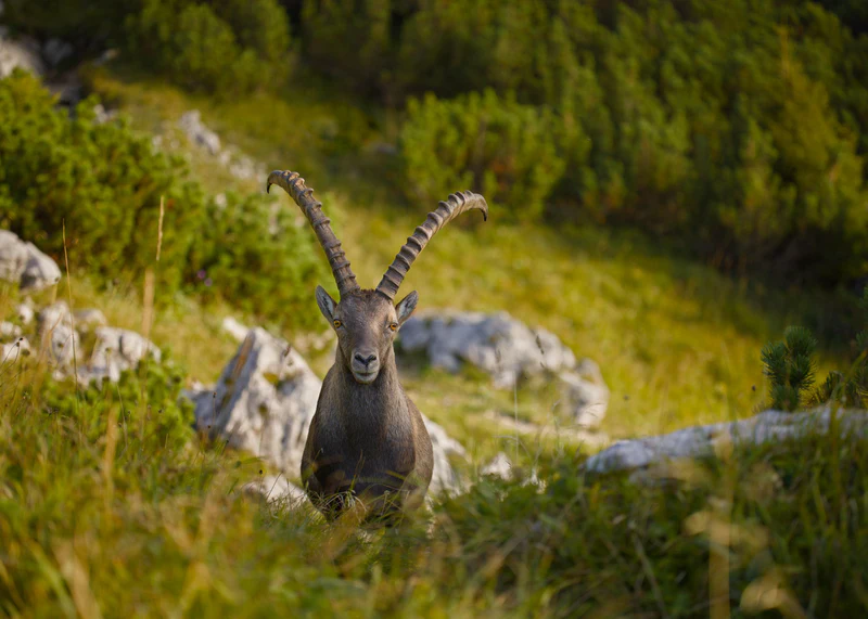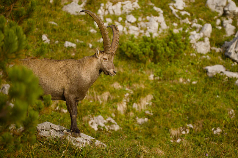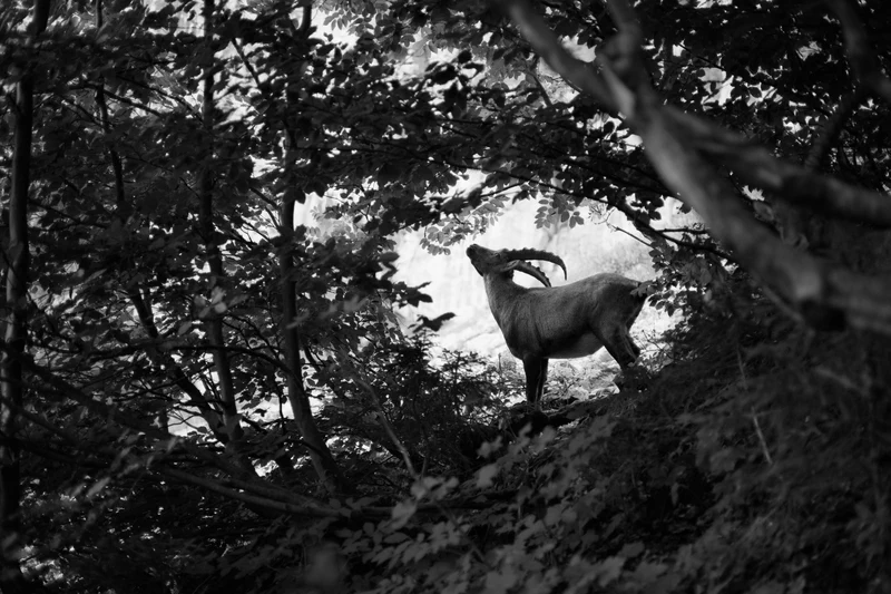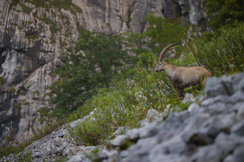 A few dozen meters later, I turned a corner and there it was: the Alpine ibex, just 15 meters away, at the edge of a clearing. But before I could even realize, the ibex disappeared between the bushes that cover most of the hillside here.